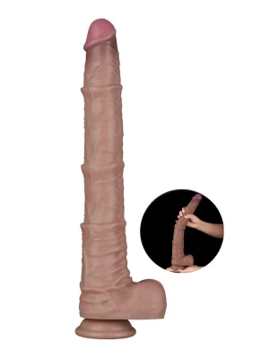 Dvigubo sluoksnio konstrukcija – tvirta vidinė šerdis ir itin švelnus išorinis silikoninis sluoksnis – suteikia pojūtį it tikra erekcija. Ryški, apvali galvutė ir išraiškingos venos išilgai kotelio sukurtos taip, kad maksimaliai stimuliuotų iš vidaus, o tekstūruotos sėklidės dar labiau sustiprina tikrovišką pojūtį ir sukelia nepaprastą malonumą.