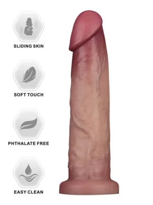 Pagamintas iš pažangaus sliding-skin silikono, šis dildo suteikia itin realistišką jausmą. Patobulinta dvigubo tankio technologija imituoja sustandėjusią varpą: išorinis sluoksnis yra švelnus ir minkštas, o tvirta vidinė šerdis užtikrina dar intensyvesnį pojūtį. Produktas gaminamas naudojant medicininį silikoną, išlaikant išskirtinį tikros odos įspūdį bei aukščiausią kokybę. Norint dar labiau sustiprinti slydimą per tikrovišką kotą, rekomenduojame naudoti vandens pagrindo lubrikantą.